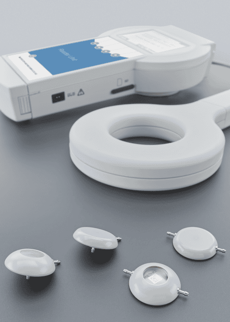 M.scio is a coin-sized device implanted along the shunt tubing at the burr hole site, with a compressible silicone membrane responding to changes in CSF pressure, which is detected by a measuring cell and transmitted telemetrically to a hand-held receiver for real-time intracranial pressure (ICP) monitoring.